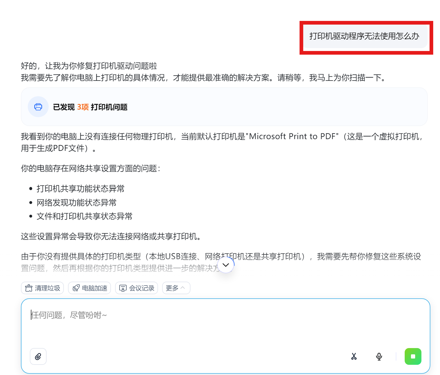 一句话解决:"帮我修复打印机驱动"
