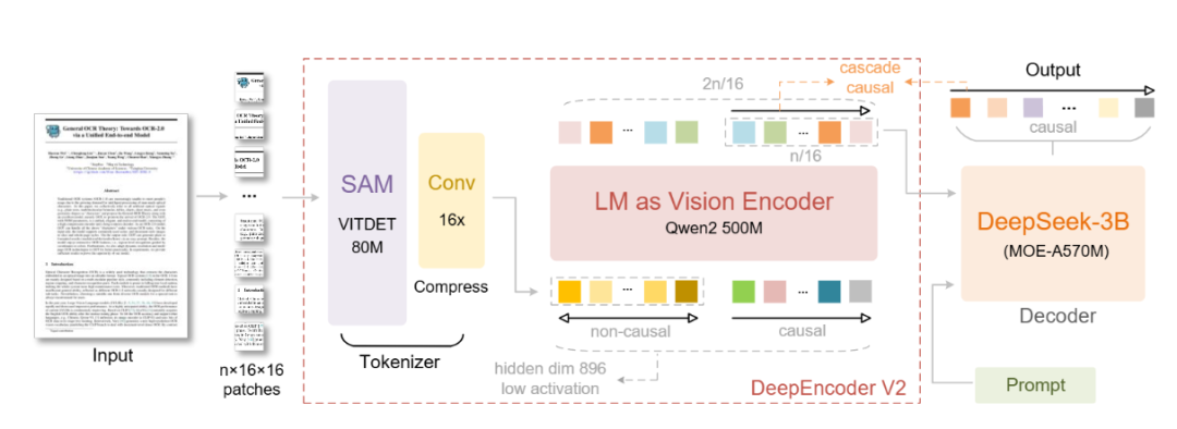 DeepSeek-OCR V2创新性地用小型LLM替换传统CLIP组件,实现了从物理压缩到逻辑感知的转变。新架构引入"视觉因果流"概念,使模型能按语义逻辑而非固定空间顺序处理图像信息。这一改进显著提高了Token效率、读序准确性,解决了"复读机"问题,为LLM理解视觉世界开辟了新路径,暗示了未来统一全模态编码器的可能性。