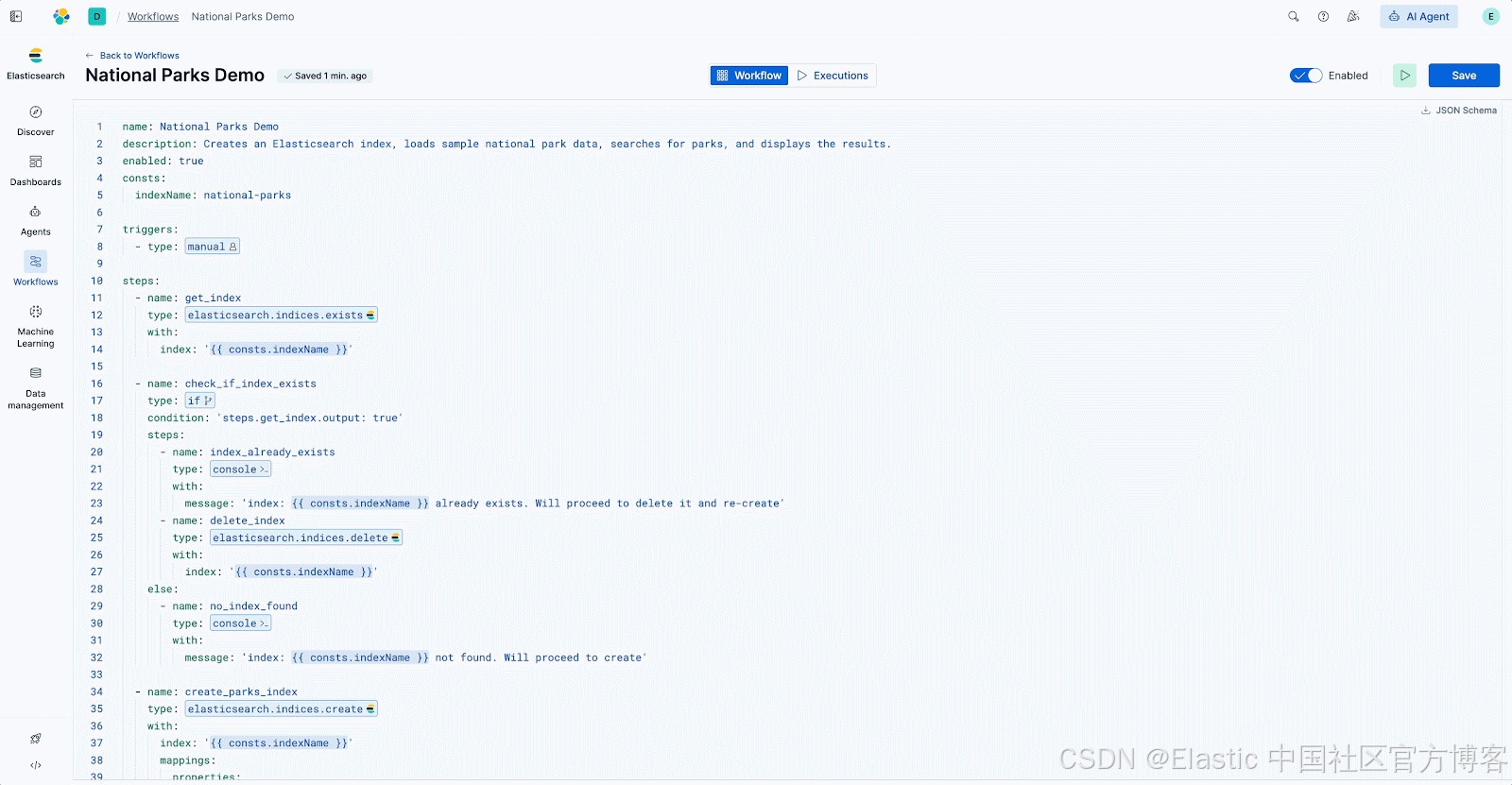 让我们构建一个展示核心能力的工作流:操作 Elasticsearch 索引、使用条件逻辑,以及在步骤之间传递数据。我们将创建一个简单的演示,设置一个 National Parks 索引,加载示例数据,并对其进行搜索。