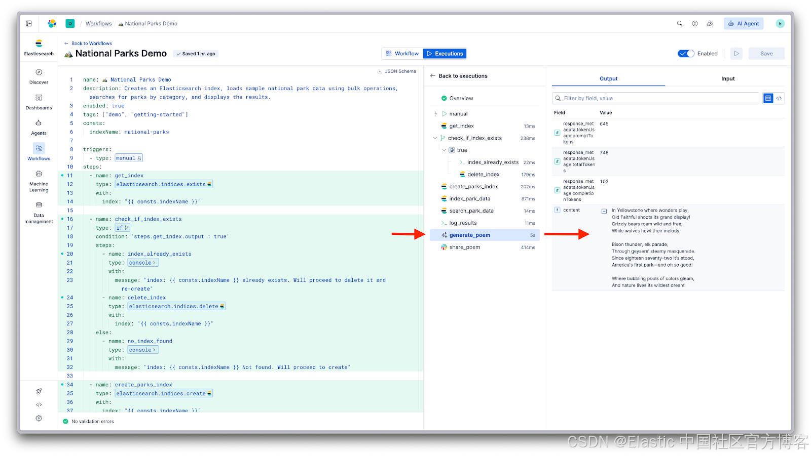 National Parks 示例展示了 Workflows 的核心组件:触发器、步骤、条件逻辑、数据流、AI 提示和外部通知。这些组件可组合构建自动化流程,协调 Elasticsearch、Kibana、外部系统和 AI 中的操作结果。