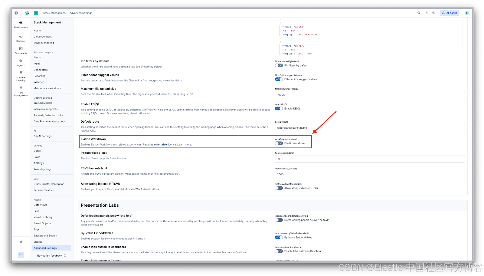 Workflows 在 Elastic 9.3 中可用( Technical Preview )。前往 Stack Management → Advanced Settings,然后启用 Elastic Workflows。