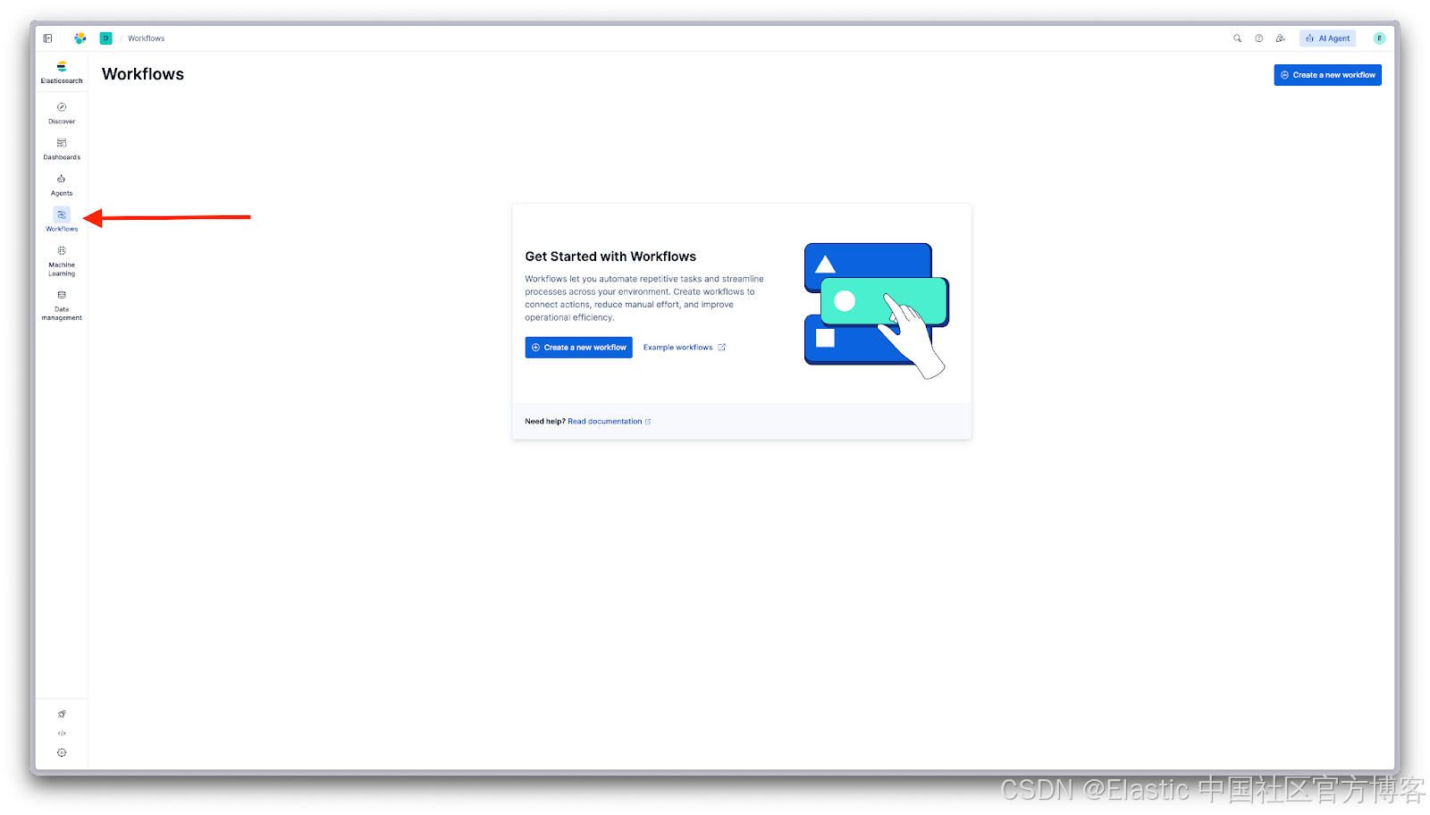 点击 Create a new workflow 打开编辑器。你也可以探索 Example workflows 来查看 Elastic Workflow Library,这是一个为 search、observability 和 security 用例准备的即用型工作流集合。