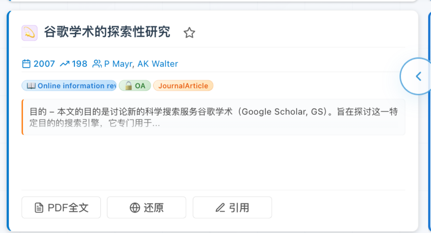 通过这些自动生成的提要,读者不必通读全文就能迅速抓住论文的精华,大大提高了阅读效率。(即时综述):当我们检索一个研究主题时,无需逐条点击阅读每篇论文,系统会自动阅读排序靠前的高相关度论文,为用户生成该主题的。驱动的学术搜索引擎,集成了丰富的功能模块,旨在提升科研人员在文献查找和阅读方面的效率。驱动的学术搜索与文献分析平台,功能丰富且贴合科研实际需求,使用体验良好,已展现出改变传统文献处理范式的潜力