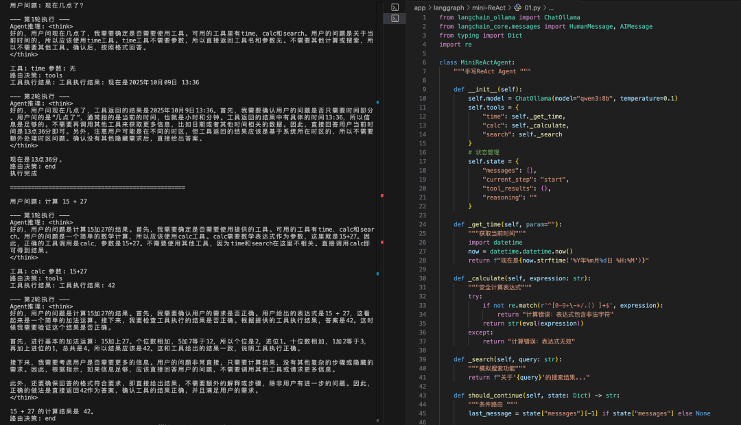 从运行截图可以看到,这个极简ReAct Agent展现了ReAct范式的工作原理:当用户问"现在几点了?"时,Agent会推理出需要调用时间工具;当用户问"什么是人工智能?"时,Agent会直接回答而不调用工具。整个示例代码实现了推理→行动→观察→回答的完整循环。
