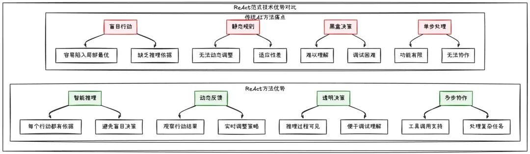 ReAct范式之所以有效,在于它解决了传统AI方法的几个问题: