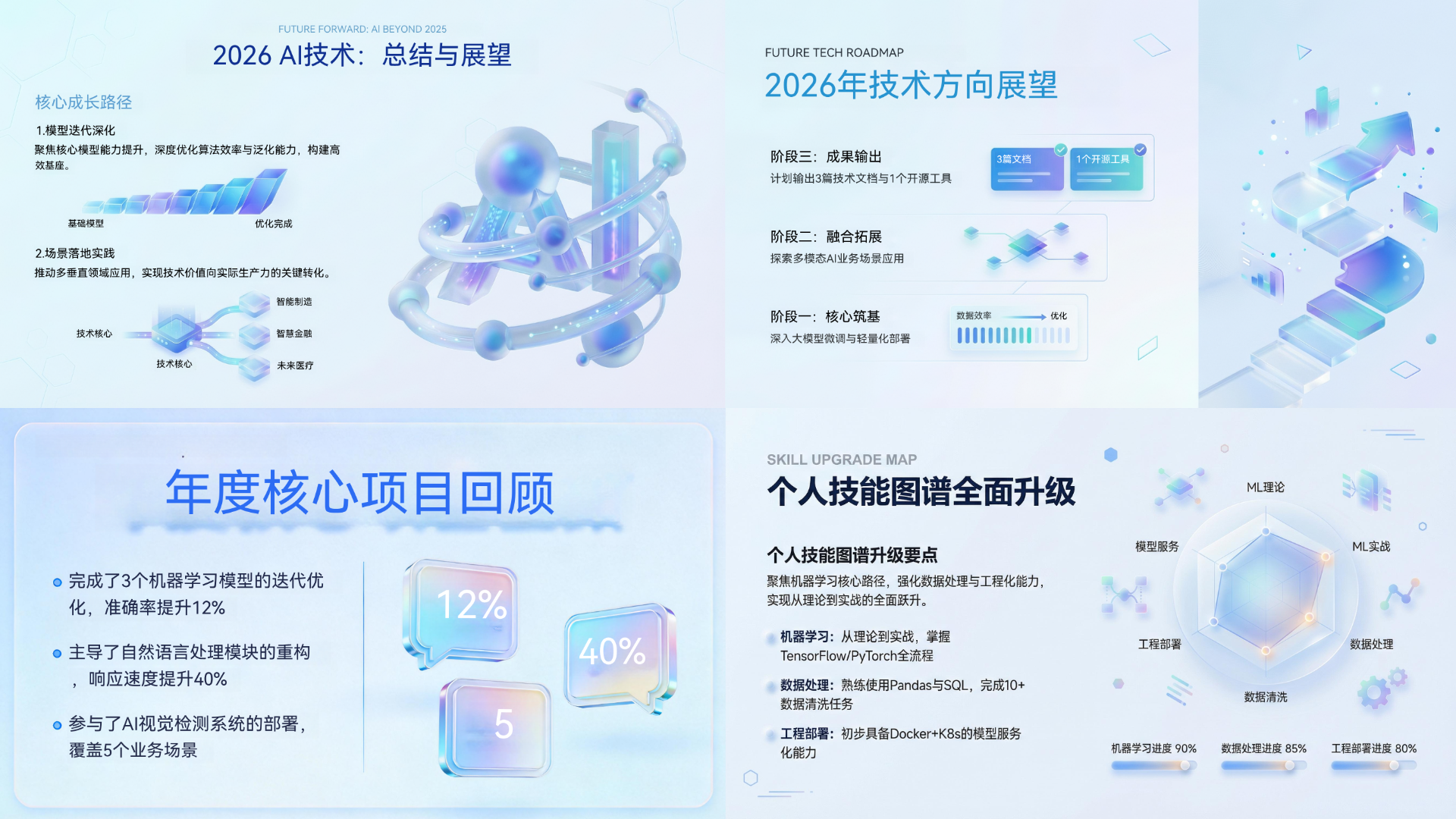 核心需求:作为科技行业职场新人,首次制作技术项目年度总结PPT,需体现专业性与科技感,让领导快速get项目核心成果与技术迭代价值,同时避免因缺乏设计经验导致页面粗糙。