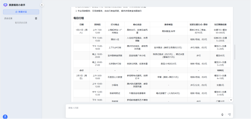 展示内容:呈现智能体与用户的实际对话界面效果,包括开场白展示、用户输入框、智能体回答区域(含结构化行程表、预算表)、工具调用结果嵌入(如天气信息、地图路线)及文档下载按钮等元素,验证界面布局合理性与功能按钮可用性。