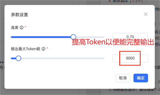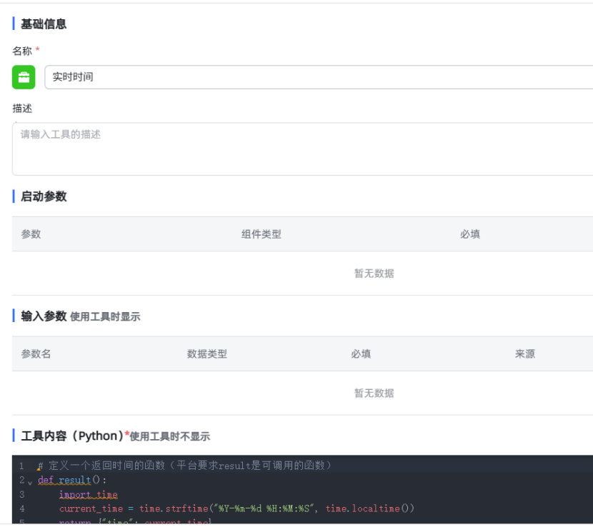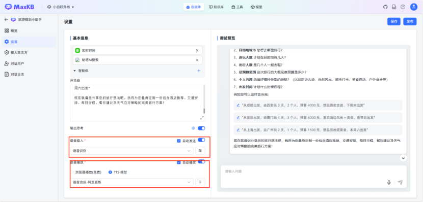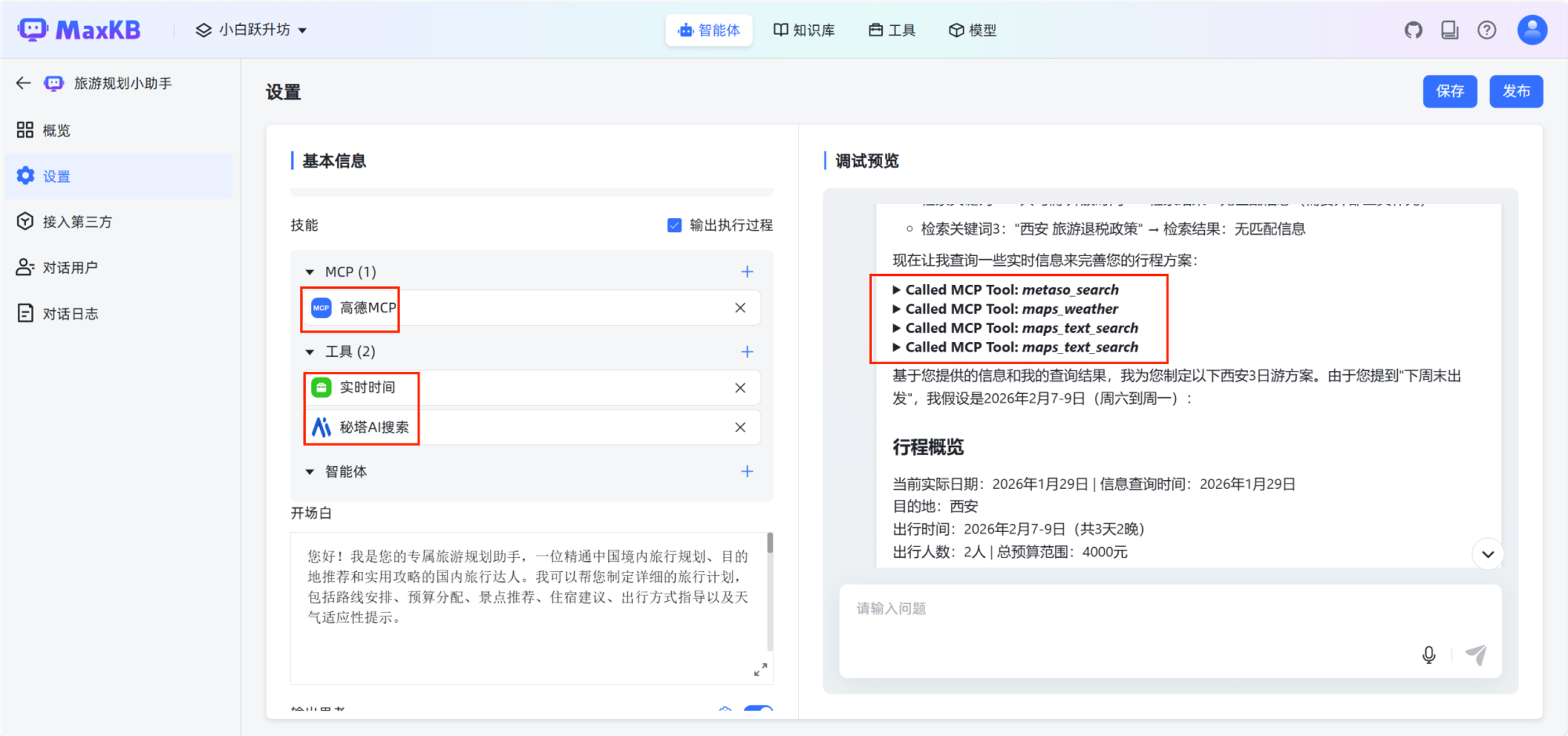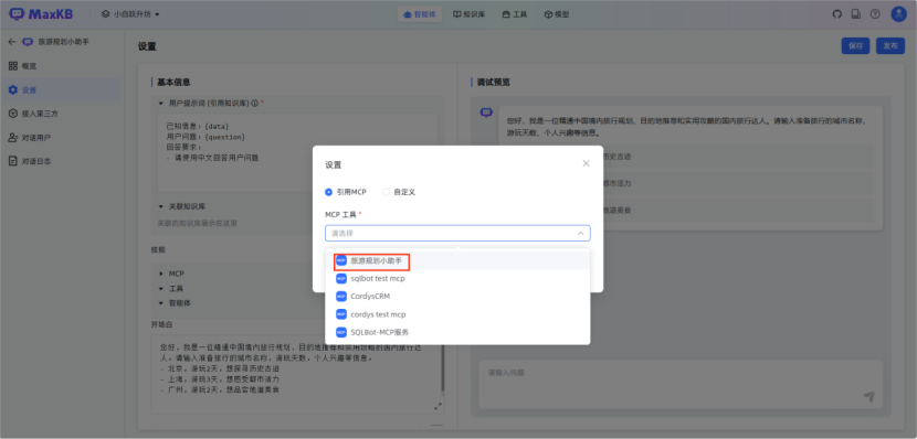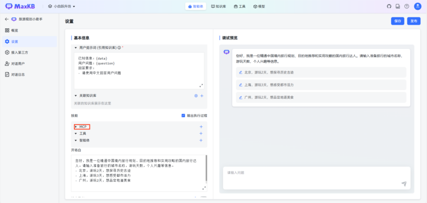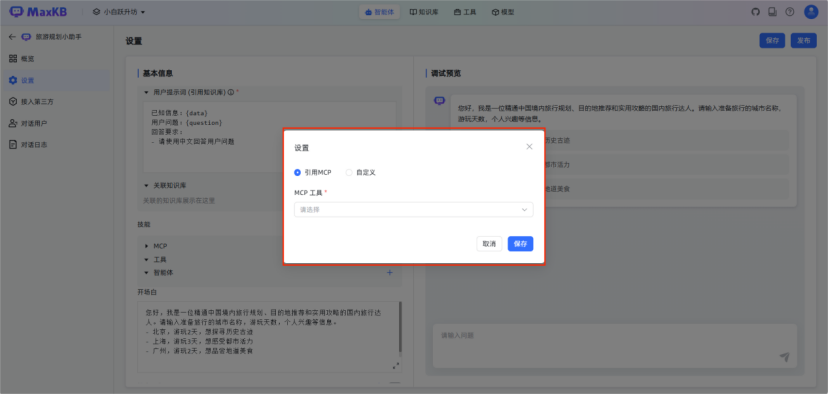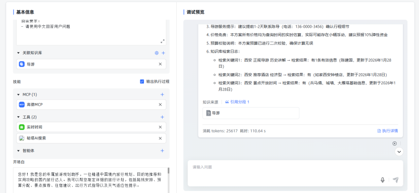 配置内容:选择需集成的工具组件(如实时天气查询工具),设置工具调用的输入参数映射关系(如将行程起止时间传入实时时间工具)。