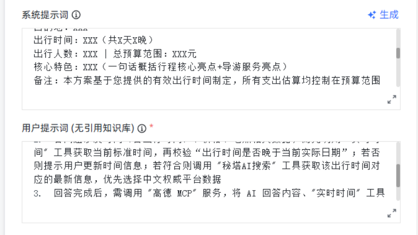 作用:定义智能体的角色定位(国内旅行达人)、核心能力边界(仅处理国内旅行相关需求)、输出格式规范(如使用标题、列表、加粗突出关键信息)及安全合规要求(如不推荐未开发景点、提醒旅行安全)。