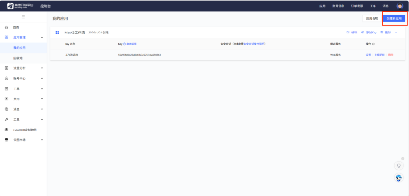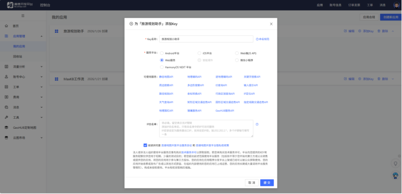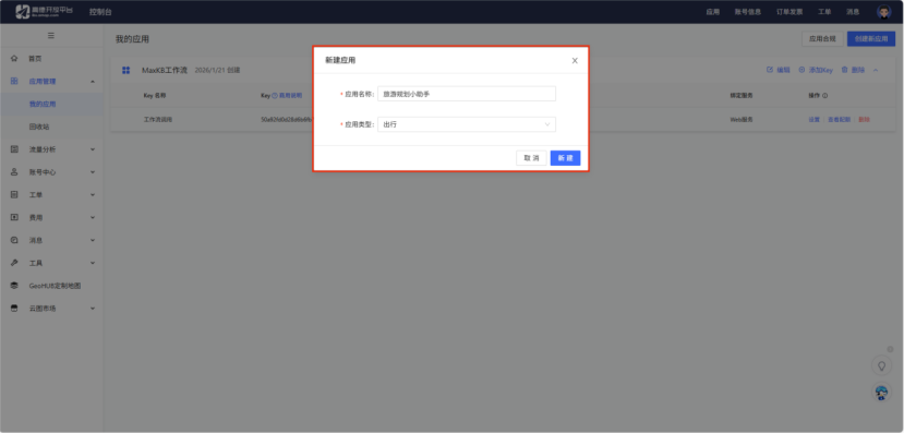 - 步骤2:创建新应用,填写应用名称(如“旅游规划助手-MCP”)及用途描述(如“提供旅行路线规划与POI查询服务”),完成应用注册;