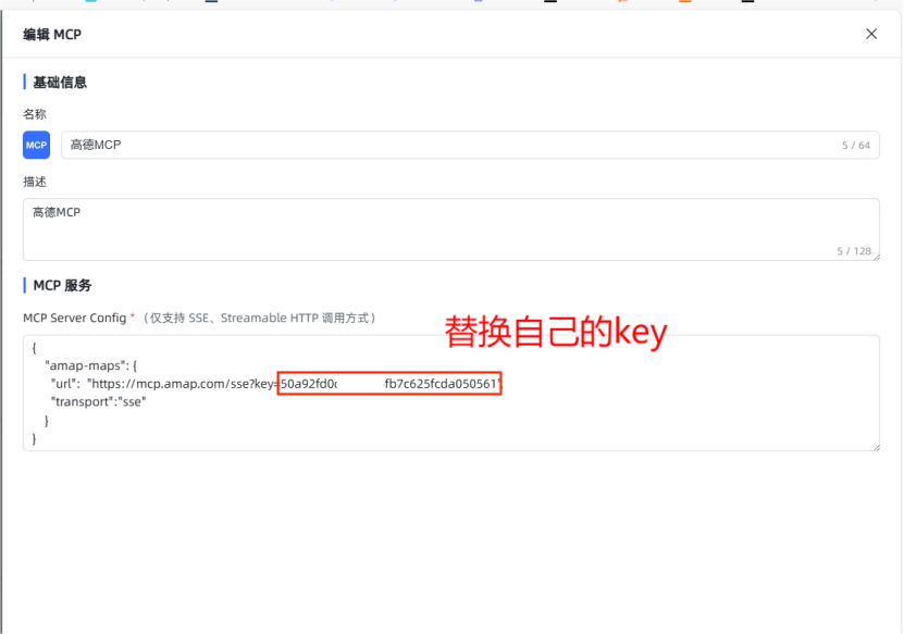 { "amap-maps": { "url": "https://mcp.amap.com/sse?key= 填入你自己的Key ", "transport":"sse" } } |