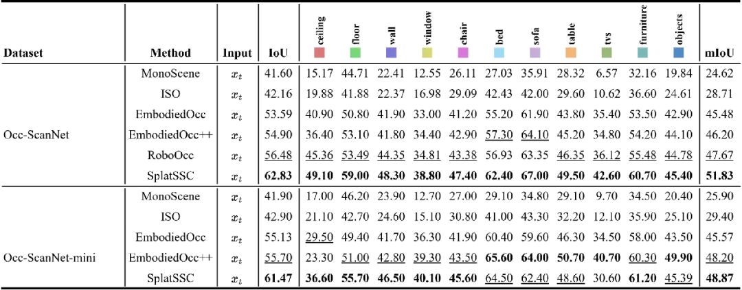 表 1:Occ-ScanNet 数据集上的局部预测性能对比。实验结果显示,SplatSSC 在 IoU 与 mIoU 各项指标上均刷新了记录。表中加粗部分代表最优结果,下划线代表次优结果