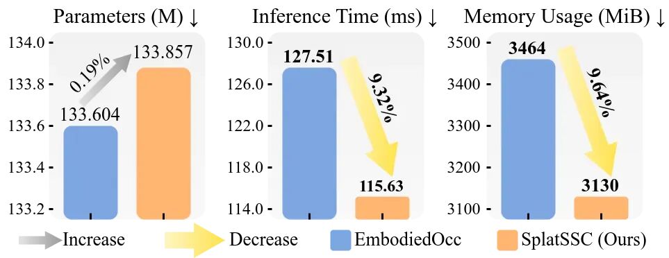 图 6:效率指标对比。实验结果表明,通过引入几何引导的稀疏表征,SplatSSC 仅付出极小的参数成本,即可显著降低推理延迟与显存占用