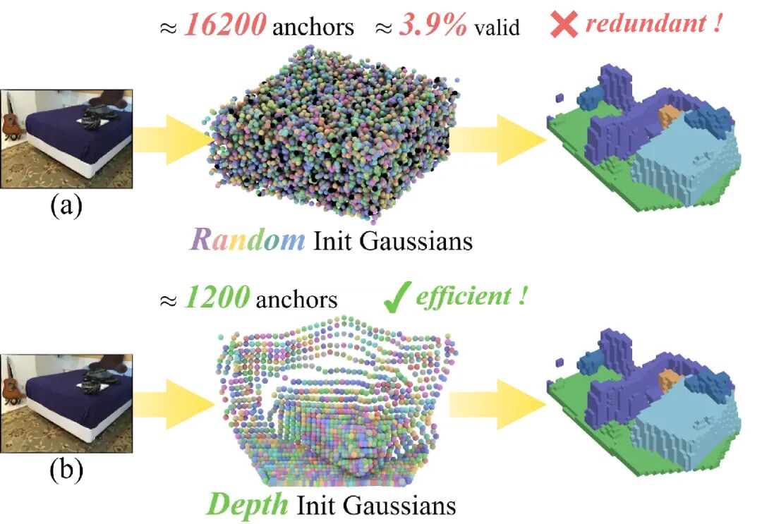 (1)基元初始化的盲目性:现有的方法往往通过在 3D 空间内随机分布数万个高斯基元来覆盖场景。实验发现,这种随机初始化的有效利用率极低(仅约 3.9%),造成了巨大的计算冗余。