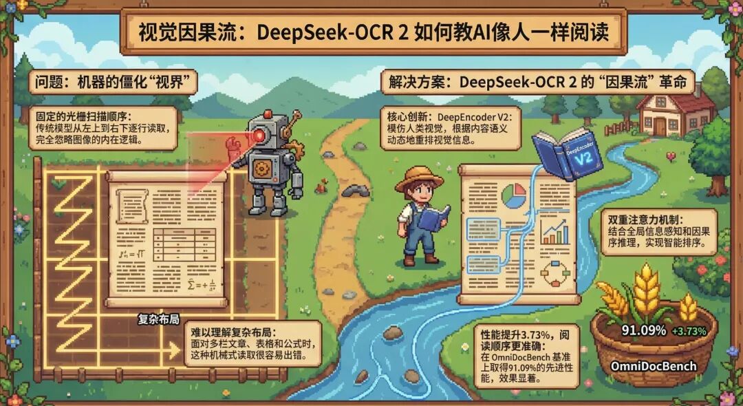 DeepSeek-OCR2(2026 年 1 月 27 日发布)证明了:视觉语言模型可以通过“因果流”和动态语义阅读顺序,实现人类级别的文档逻辑理解,从而大幅超越传统固定栅格扫描的局限。