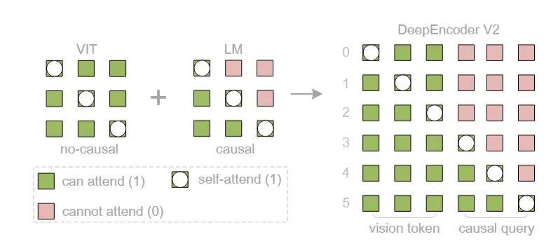 DeepEncoder V2 注意力矩阵被拼接成了左右两部分,分别对应不同的 Token 处理方式: