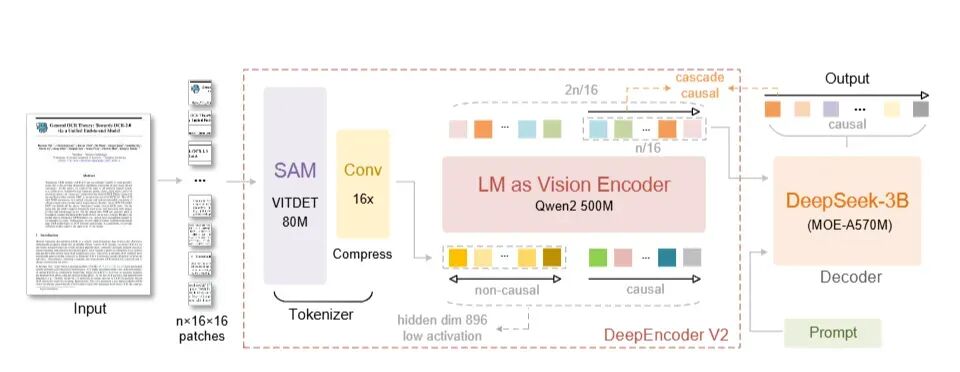 DeepEncoder V2:将 CLIP 替换为 LLM 风格的架构 (Qwen2 500M)。这一部分被称为“LM as Vision Encoder”,它引入了因果推理能力。