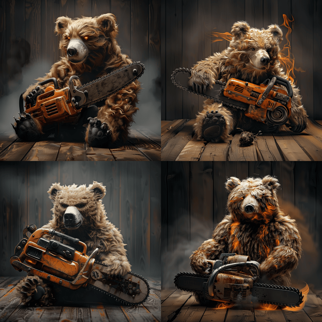 bash https://cdn.acedata.cloud/8fapzl.png https://cdn.acedata.cloud/c1igbw.png The bear is holding the chainsaw --iw 2
