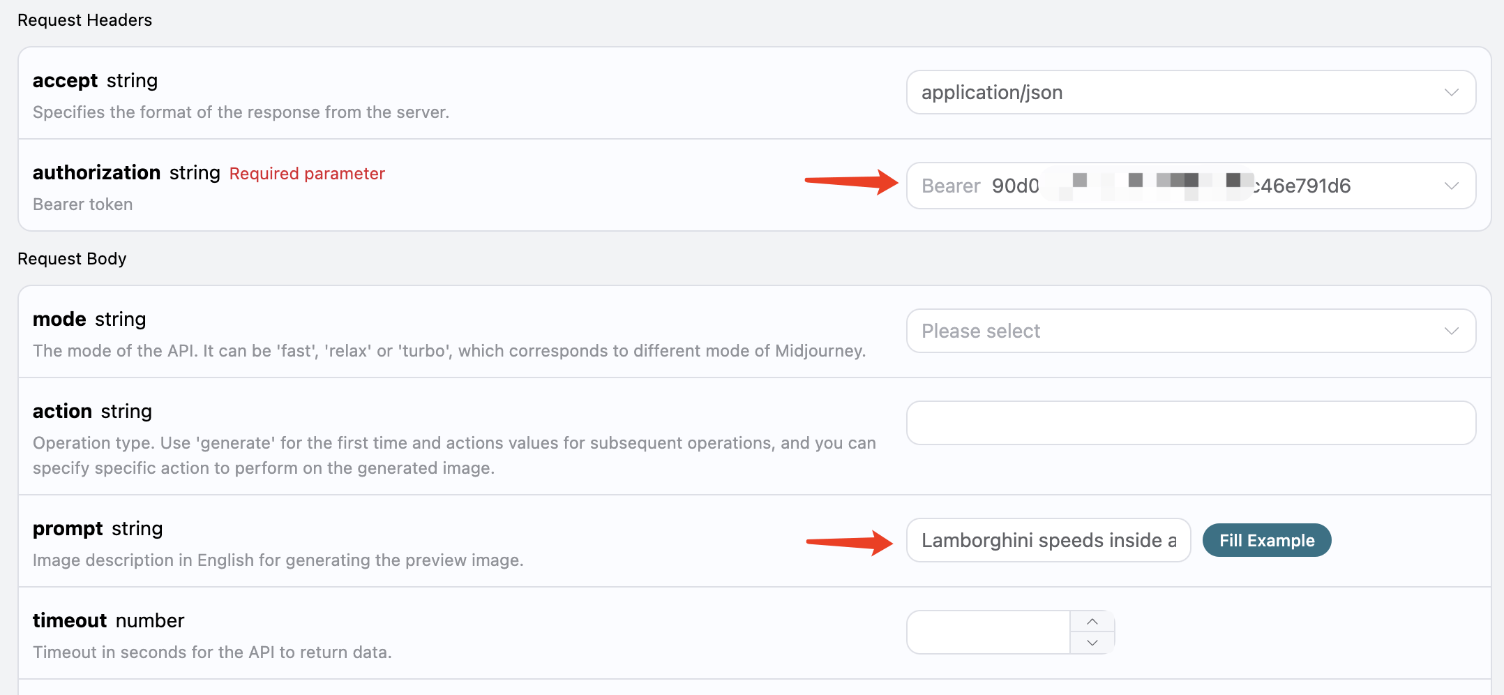 在第一次使用该接口时,我们至少需要填写两个内容,一个是 authorization,直接在下拉列表里面选择即可。另一个参数是 prompt, prompt 就是我们想生成的图片描述内容,建议用英文描述,画的图会更准确效果更好,这里我们用了示例内容 Lamborghini speeds inside a volcano,代表要画一个兰博基尼在火山飞驰。