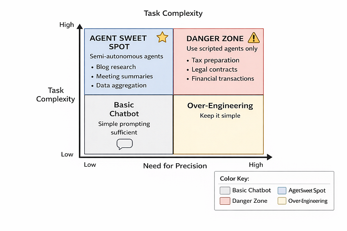 高复杂度 / 低精度(如“研究潜在博客主题”或“汇总50份会议纪要”):这是智能体的黄金地带。第二级和第三级智能体在此大放异彩。任务对人类而言因繁琐多步而困难,但即使智能体漏掉一个小细节,也不会造成严重后果。这里你能获得巨大投资回报。