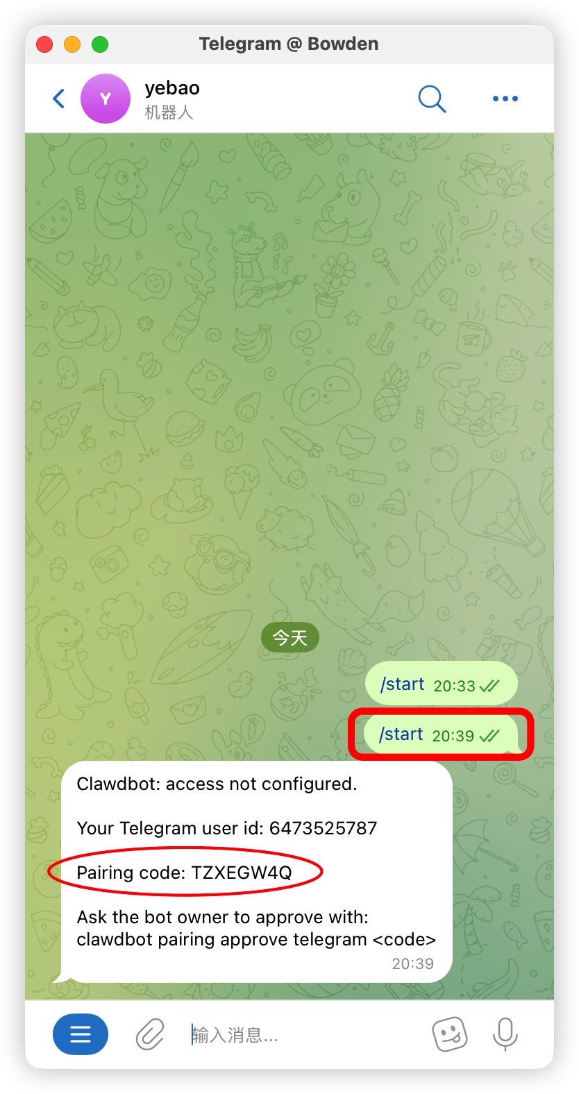 在 Telegram 向你的机器人发送任意消息,它会回复一个 配对码 (Pairing Code),例如 TZXEGW4Q。