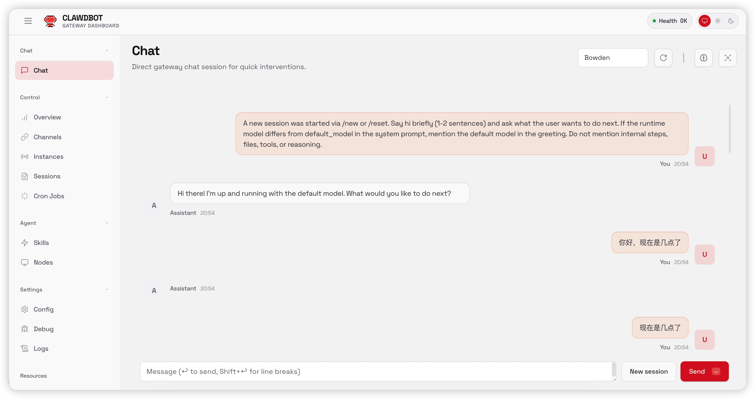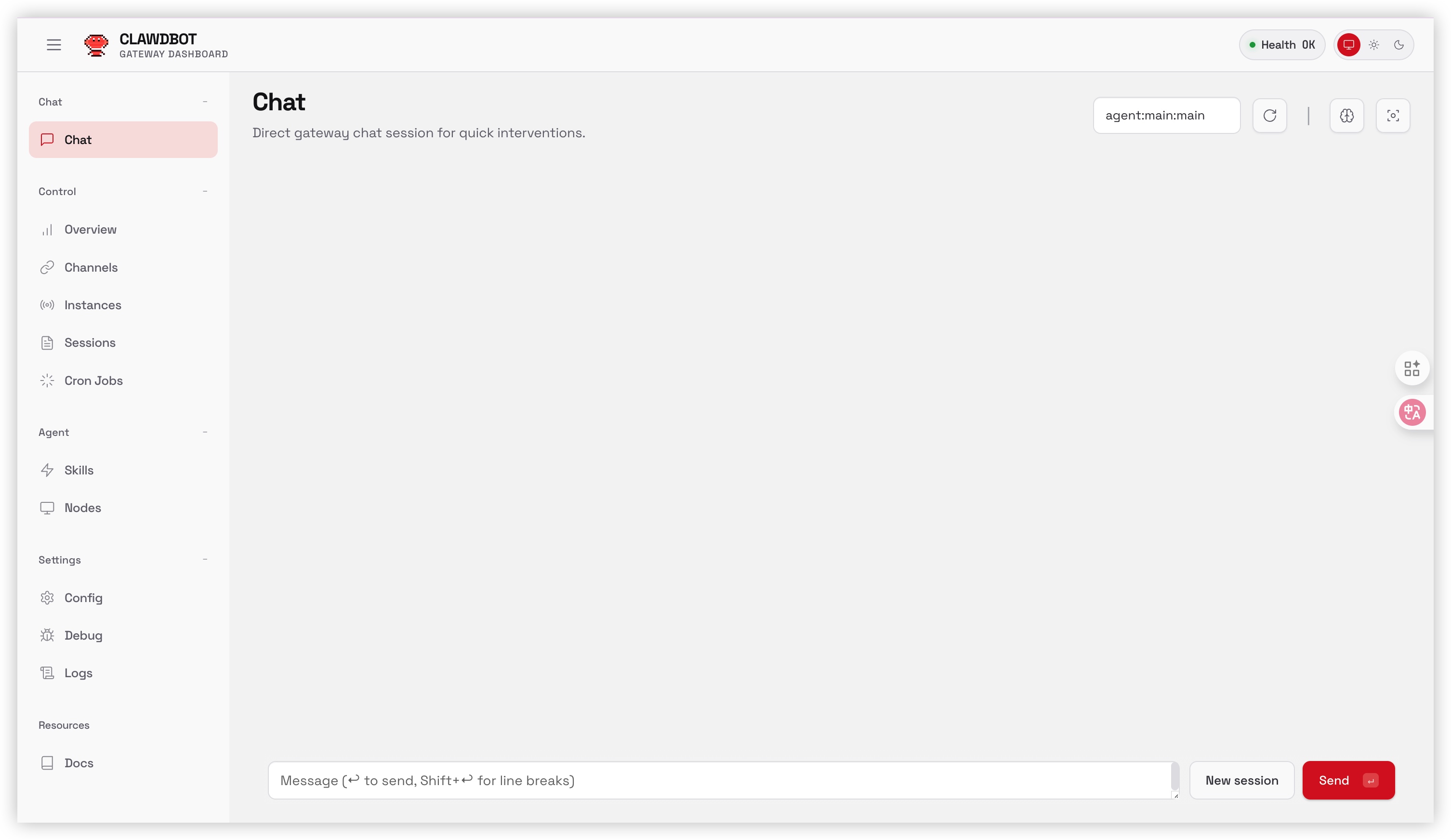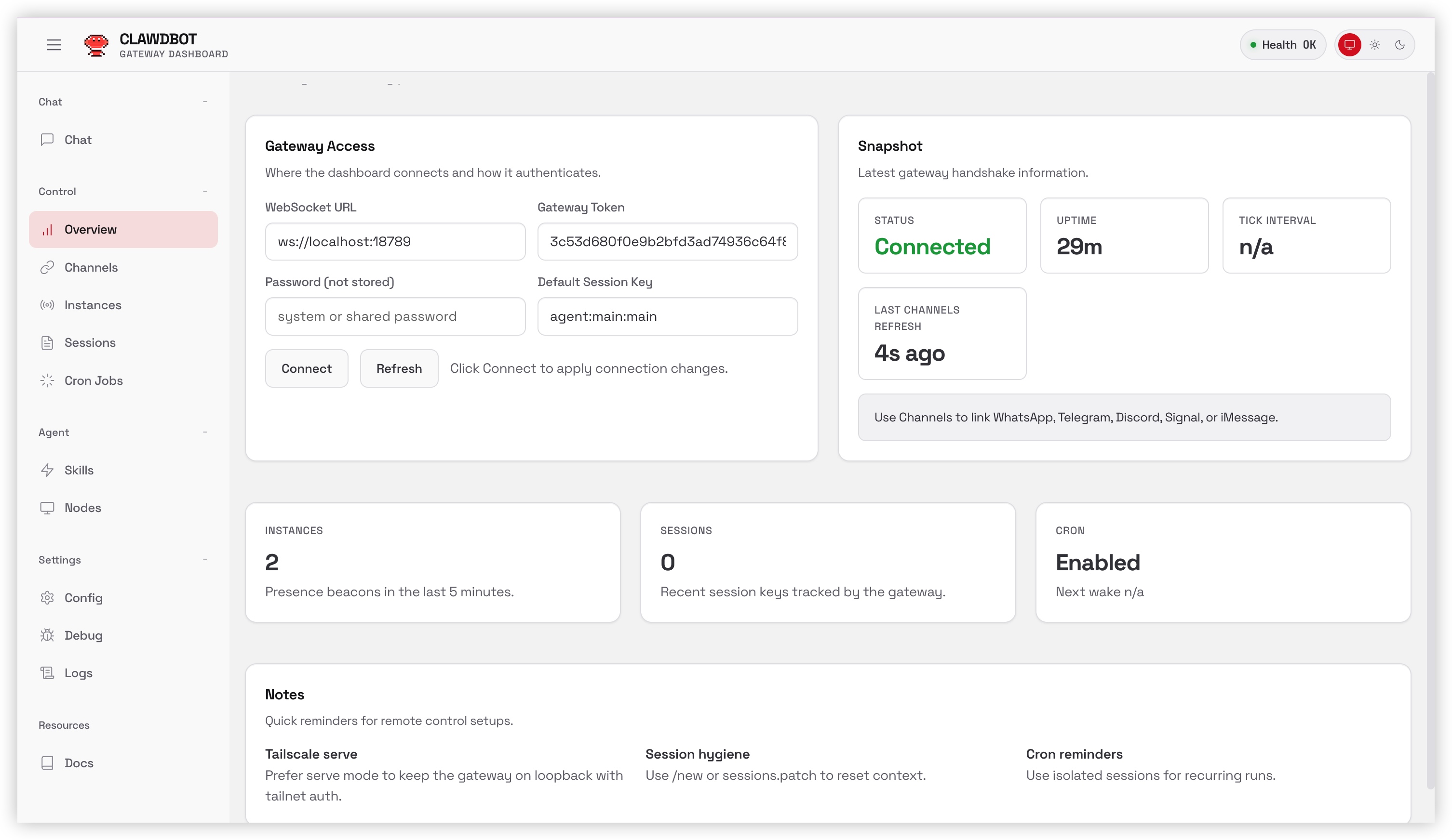 图示说明:这是 Moltbot 的 Web UI。你可以在这里配置系统参数、查看日志以及管理连接的聊天渠道。