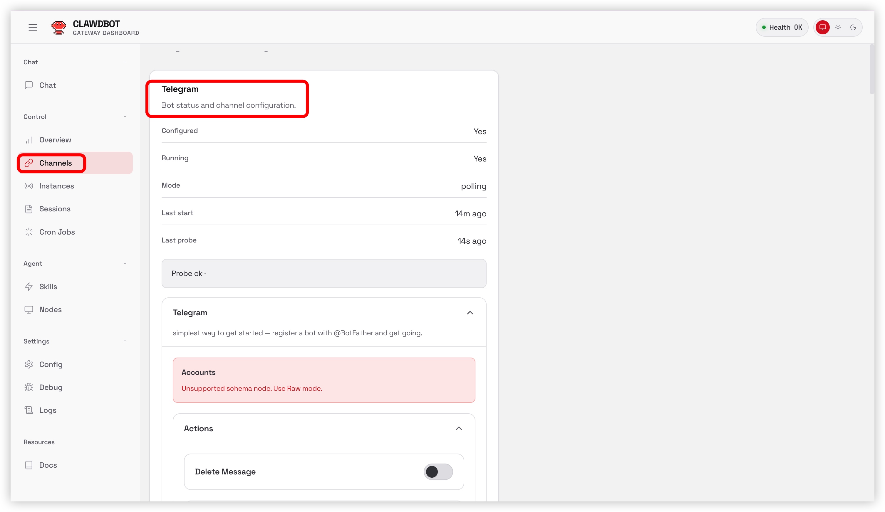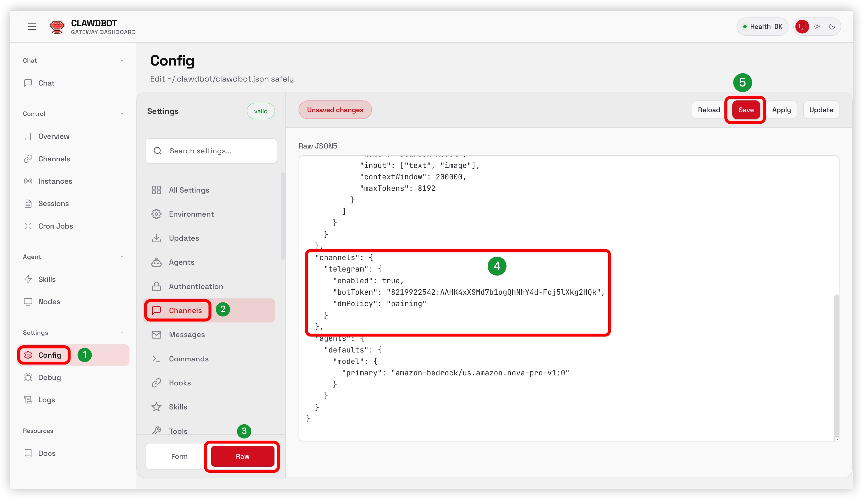 回到 Moltbot 的 Web 界面,找到 Channels 配置段,启用 Telegram 并填入 Token。