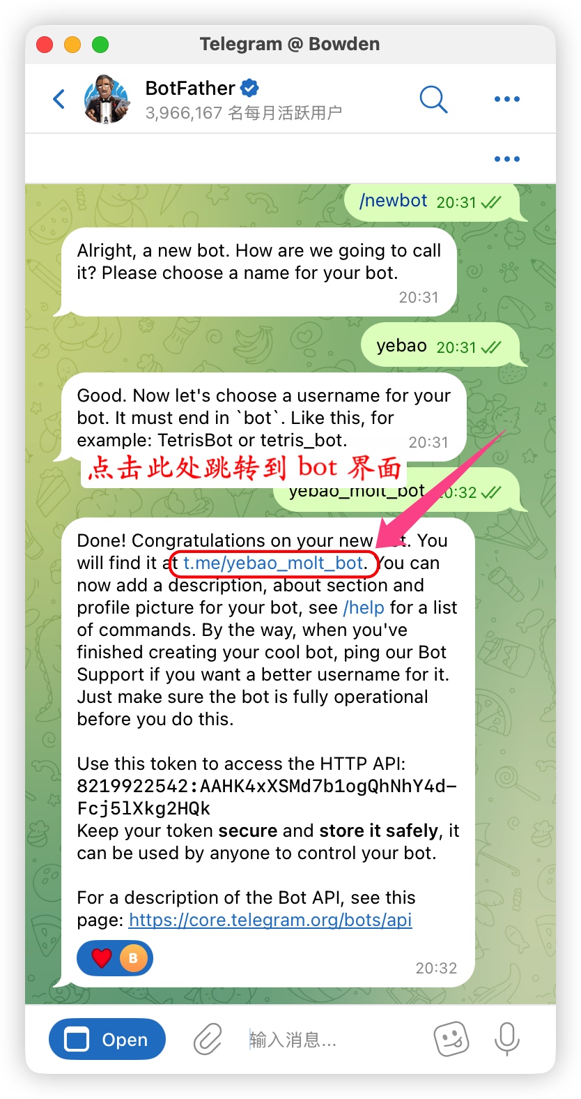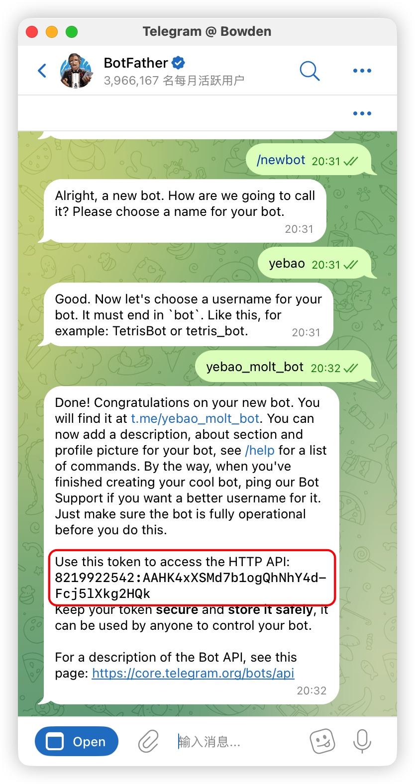 (2) 设置Bot用户名(必须以 bot 结尾,比如 yebao_molt_bot) BotFather 会返回 Token