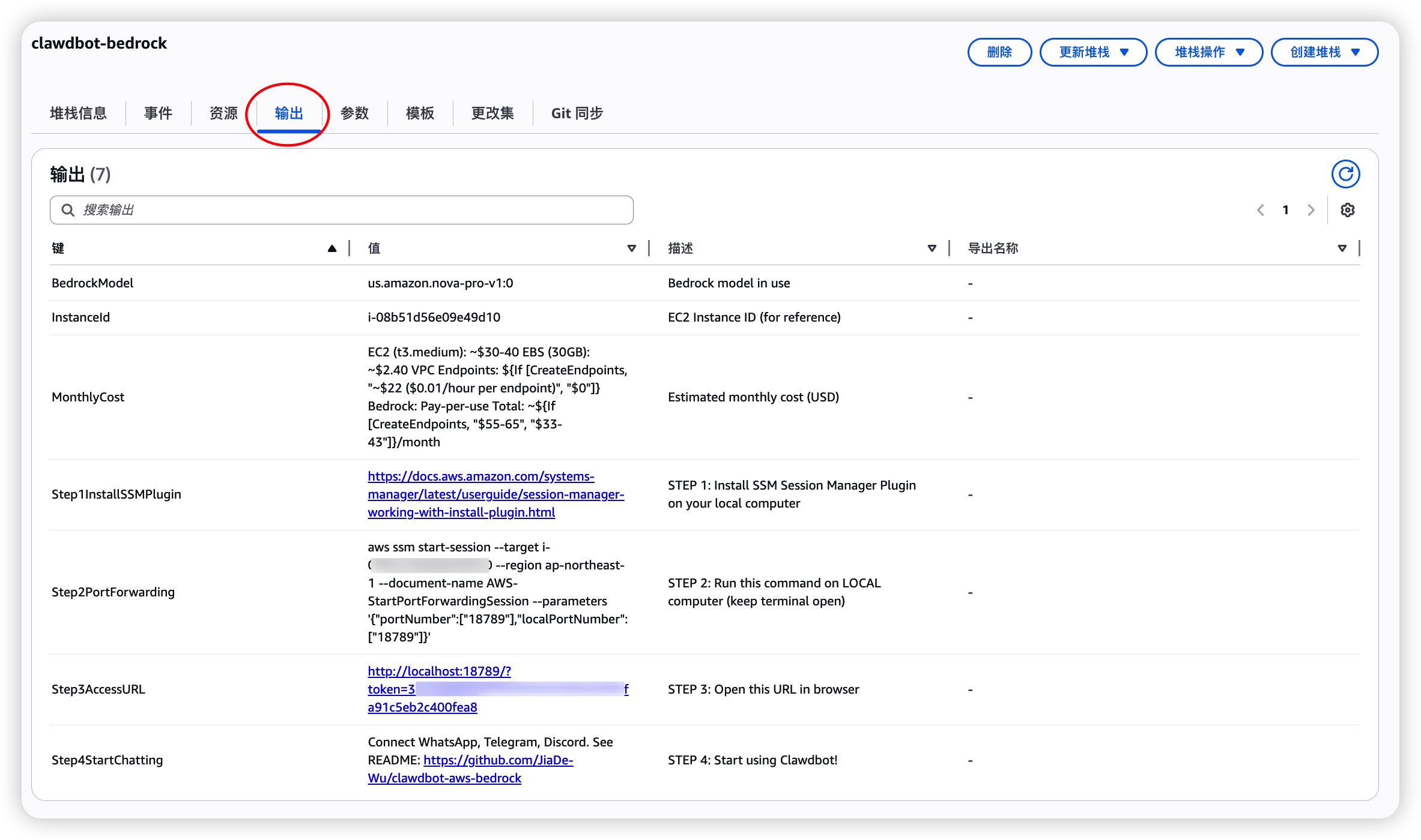 在 CloudFormation 堆栈状态显示为 CREATE_COMPLETE 后,请点击堆栈详情页顶部的 “输出 (Outputs)” 选项卡(如上图红圈所示)。已经为你预生成了所有必要的连接信息,你不需要去 EC2 控制台翻找 IP 地址或手动拼写命令。