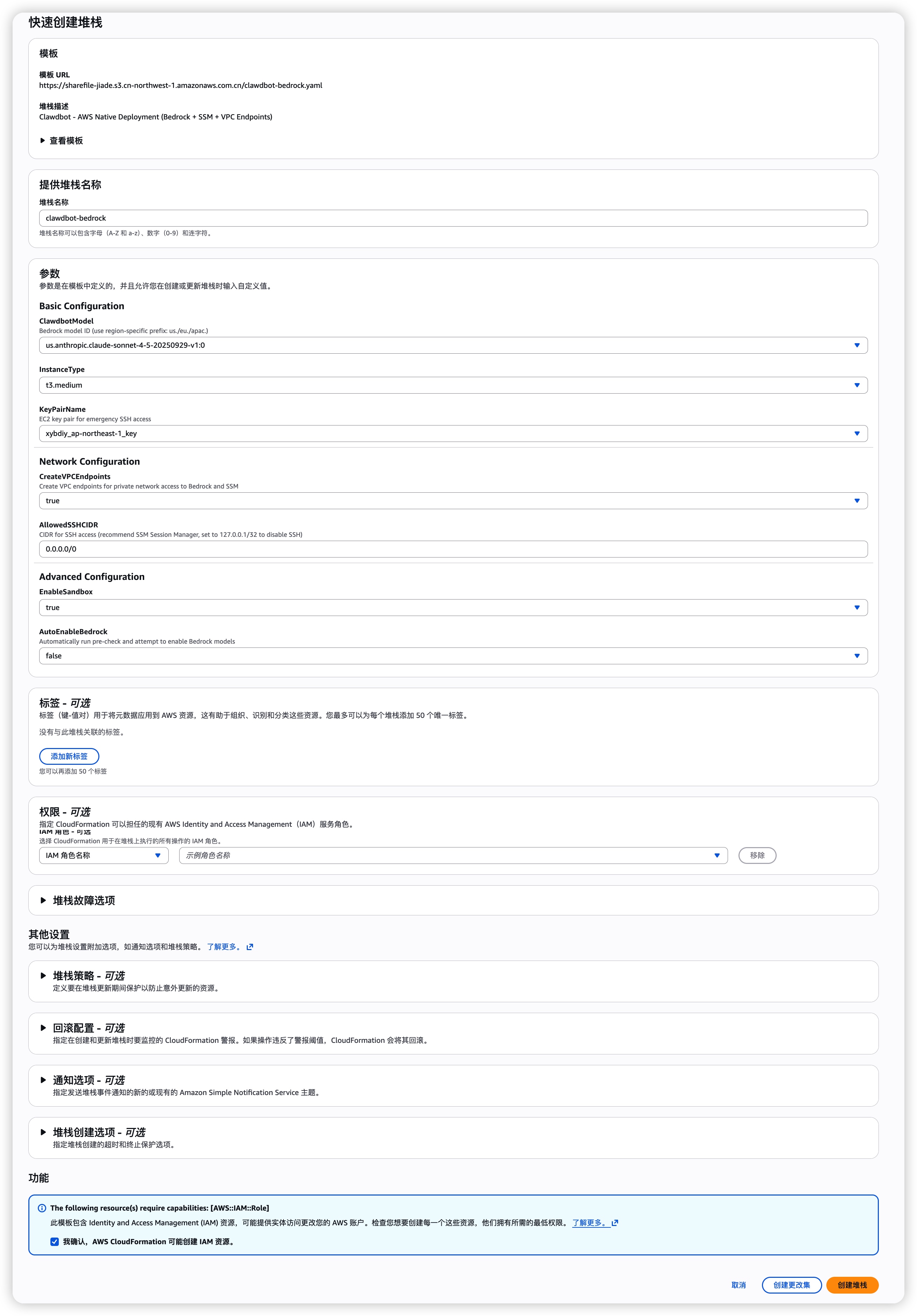 - 配置参数:设置堆栈名称(如 Moltbot-Stack)及网络配置。