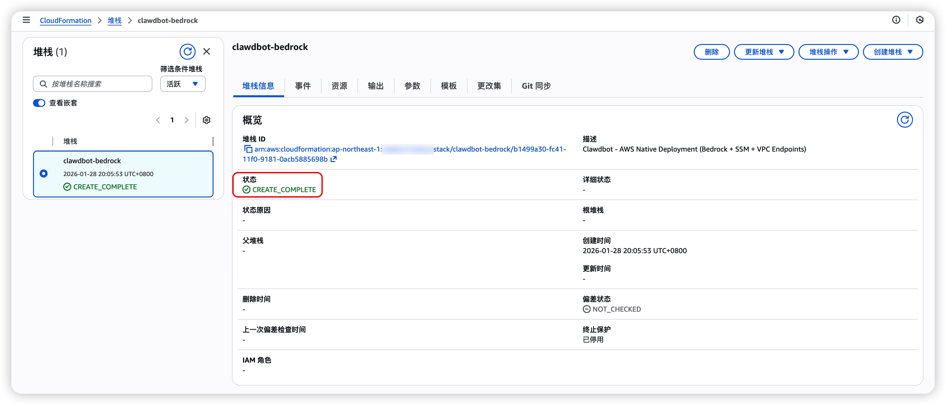 等待创建完成:提交后,等待堆栈状态变为 CREATE_COMPLETE。