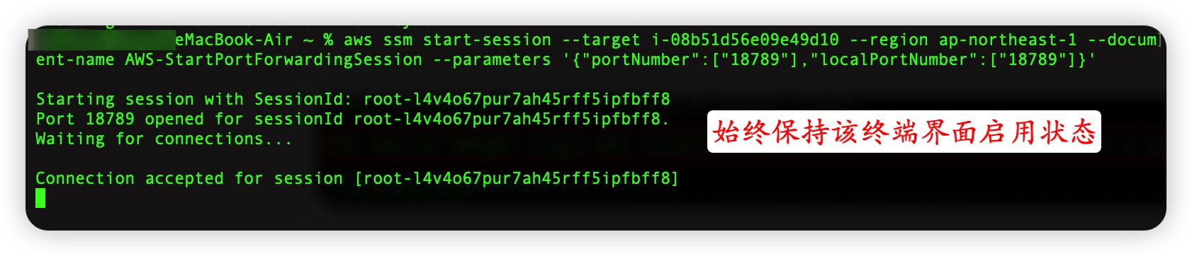 aws ssm start-session --target i-xxxxxxxxx --region ap-northeast-1 --document-name AWS-StartPortForwardingSession --parameters '{"portNumber":["18789"],"localPortNumber":["18789"]}'