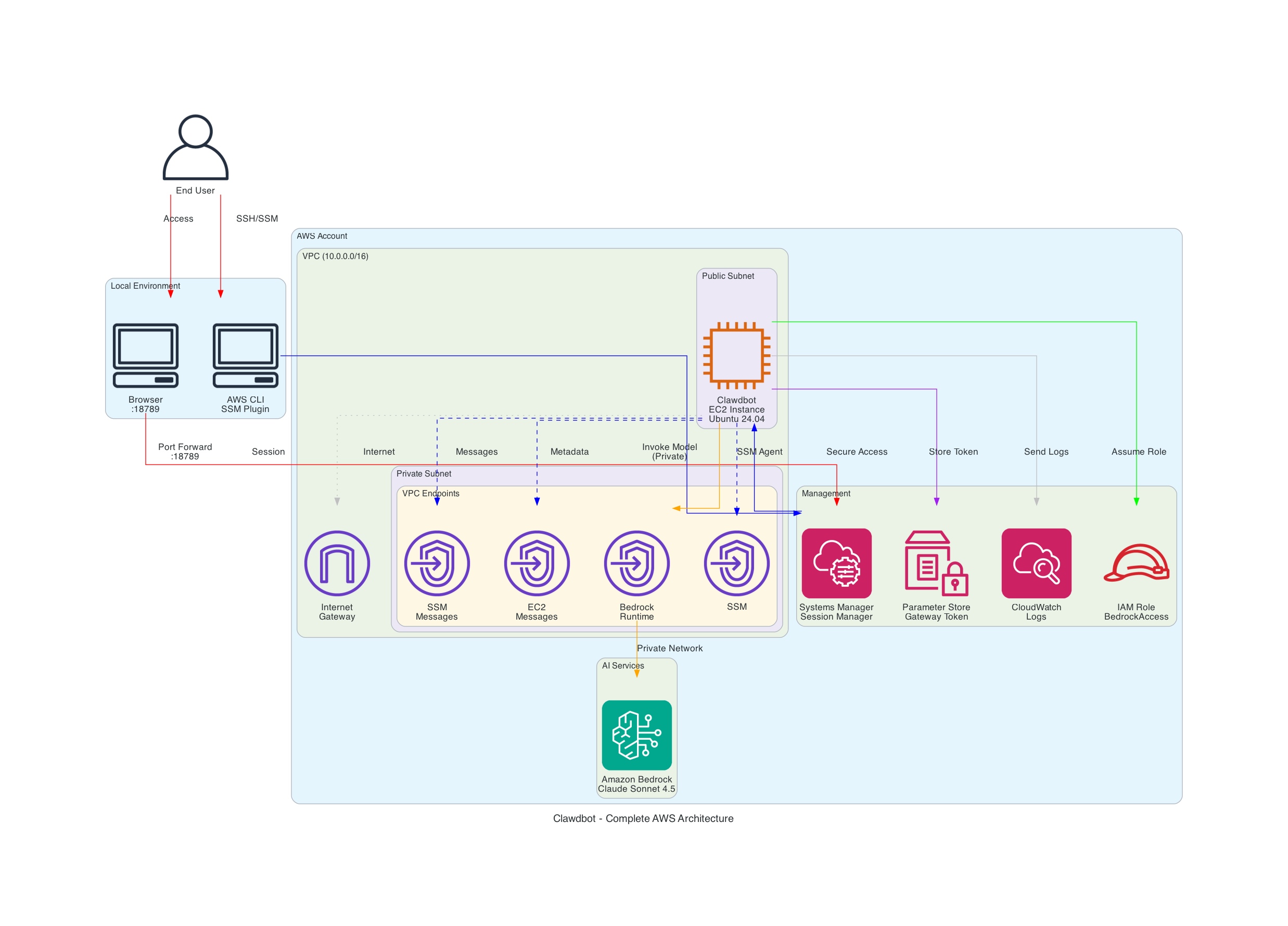图示说明:上图展示了完整的网络拓扑。用户(左侧)通过 SSM 安全隧道连接到 VPC 内部的 EC2 实例。EC2 实例通过内部网络直接调用 Bedrock API,确保了极高的数据安全性。