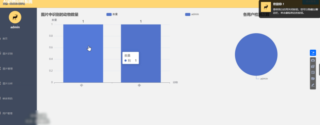 在图片分析功能中,对当下系统中识别的动物图片的数量以柱状图进行展示,该模块主要是为了更好进行信息数据的统计,通过数据的统计来更好的统计计算机的图像识别量,也方便管理人员更好的掌握深度学习计算机的训练量