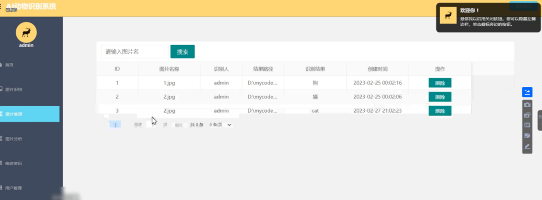在图片管理的功能中,可以看到所有系统中上传的图片信息,有上传的图片名称、识别用户的名称、识别的结果是什么动物等信息,以管理员的角色可以对上传的图片执行删除操作。