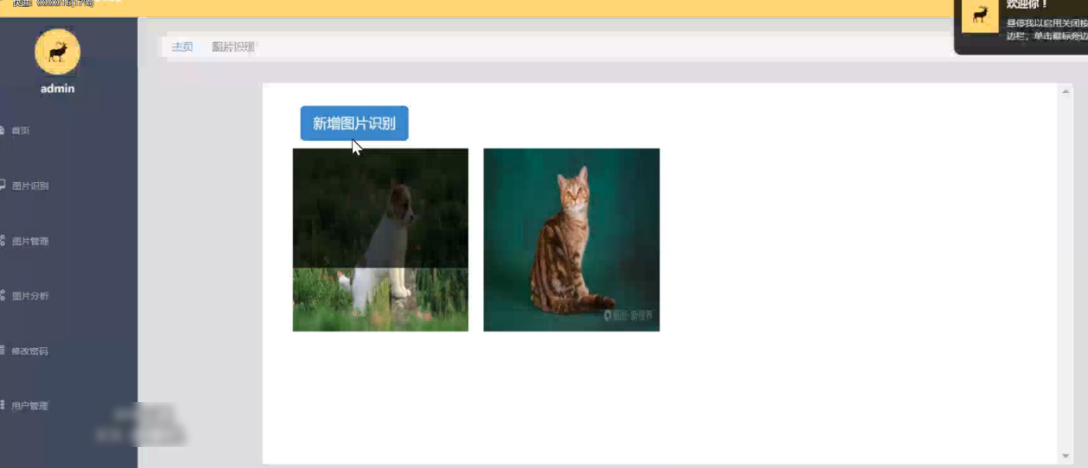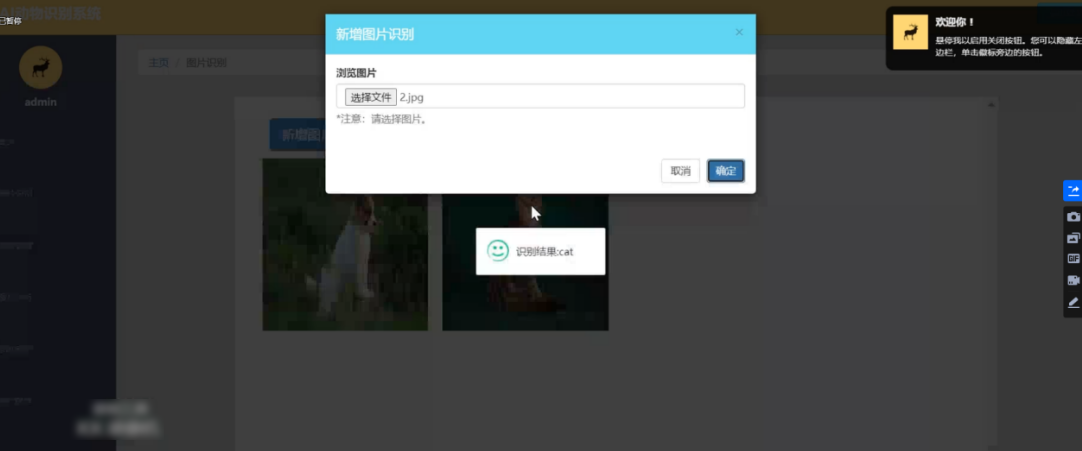 当进入到图片识别的功能中后,可以在主页面中查看到有已经上传的图片信息,当需要新增识别图片时,可以点击新增图片识别,再点击选择图片,打开电脑中存储的照片后点击确定,系统会自动对上传的图片中的动物进行识别,在短暂的识别后以英文或者中文反馈图片中的动物名称