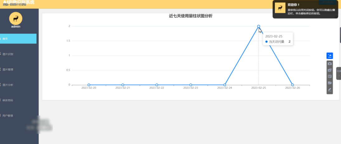 在以管理员的角色完成登录之后,整个网站的首页页面展示如下图,在首页中会通过可视化的数据分析来对近七天的系统使用率进行一个折线图的展示,在功能菜单模块中,有图片的管理菜单、图片的识别菜单、图片的分析等功能,按照本次的设计可以满足对动物图片识别的需要。