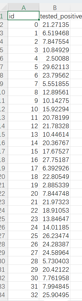 csv_writer.writerow(["id", "tested_positive"]) #写入表头:设定好列名