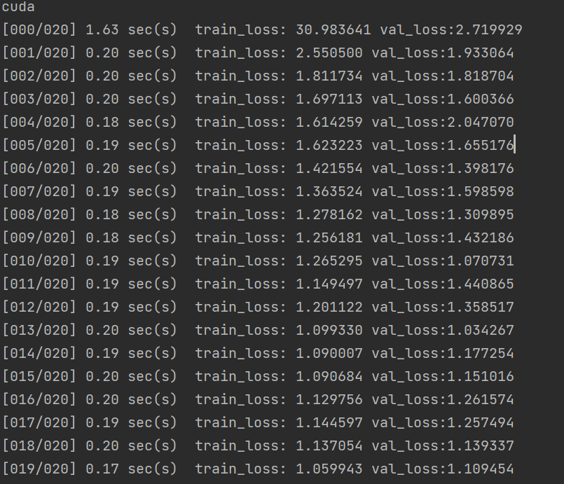 loss = mseLoss #将loss变量指向了mseLoss函数,后续调用 loss()等价于调用mseLoss() epochs = 20 #训练轮次 lr = 0.001 #学习率 device = "cuda" if torch.cuda.is_available() else "cpu" #自动检测当前环境是否支持 cuda(即是否有可用的 NVIDIA GPU),没有则使用 CPU进行计算 print(device)