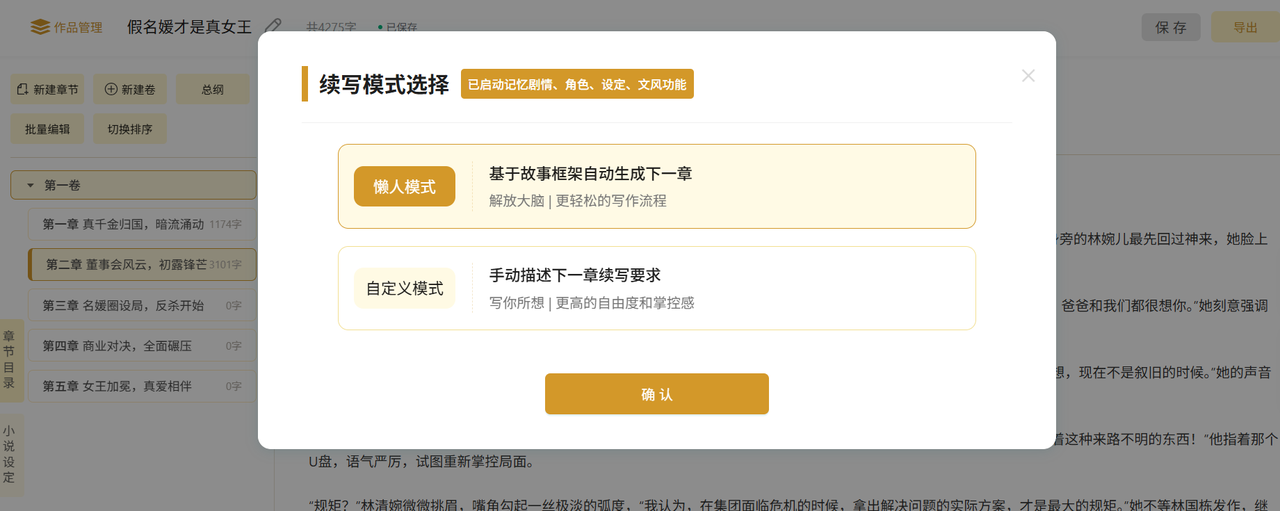 适用场景:正文卡文续写、扫榜拆书、生成符合编辑口味的大纲。