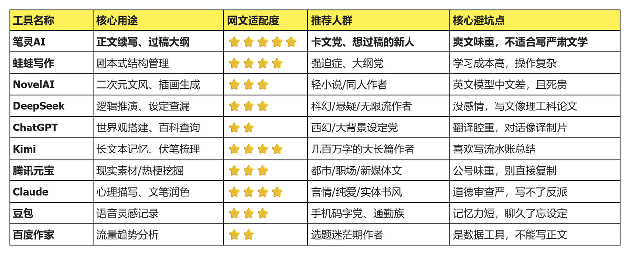为了方便大家一眼看懂,我把这10款写小说软件的核心优缺点做了一个简单的对比表,建议收藏保存,根据自己的需求“对号入座”。
