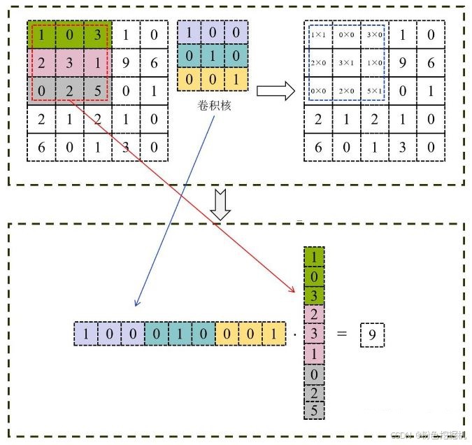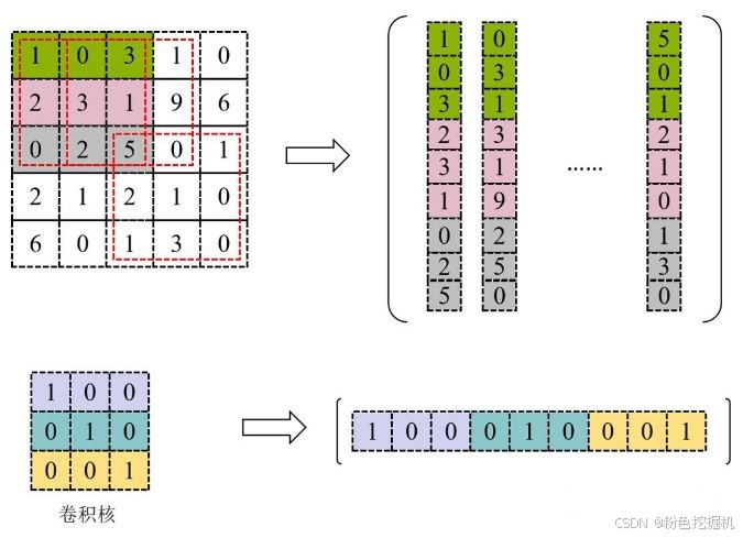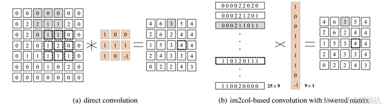 使用 Im2Col 将输入矩阵展开为一个大矩阵,矩阵每一列表示卷积核需要的一个输入数据,按向量方式存储;将卷积核展开为行矩阵进行存储。