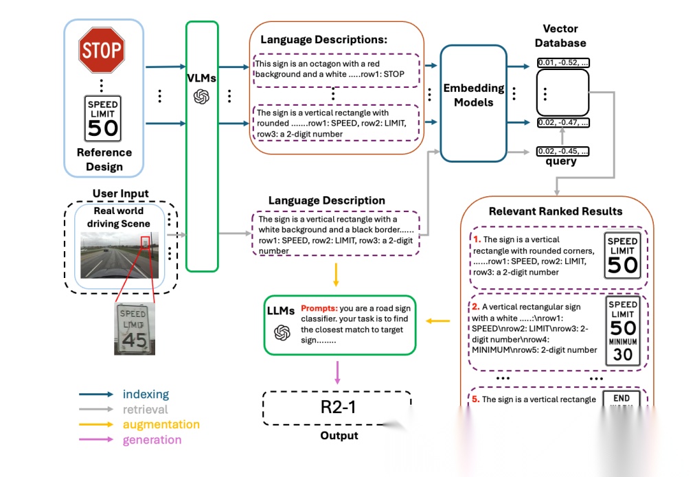 SignRAG 是建立在 RAG 之上的零样本交通标志识别系统。它使用视觉-语言模型来描述标志图像,从向量数据库中检索相似的标志设计,然后让 LLM 对候选标志进行推理以识别正确的标志,无需进行特定任务的训练。