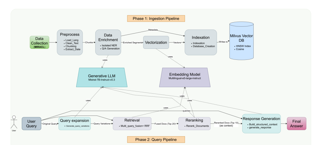这是一个针对充满噪声的历史报纸问答的多语言 RAG 系统。它通过语义查询扩展、使用倒数排名融合(Reciprocal Rank Fusion)的多查询检索,以及仅在存在证据时才回答的生成提示词,来处理 OCR 错误和语言演变问题。