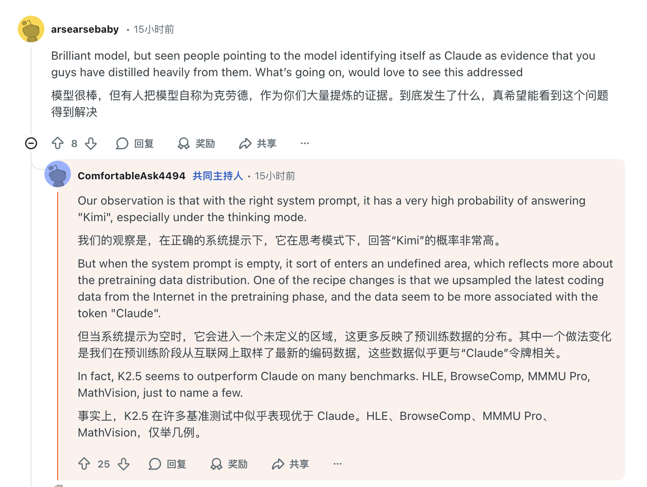 “我们的观察是,在合适的系统提示下,它有很大概率会回答自己是 ‘Kimi’。”