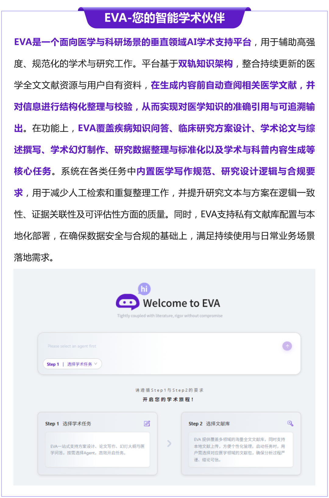 AI方案靠不靠谱,取决于它是否具备一条可复核的生产链路:RAG把内容锁定在可控证据域内,动态校验把临床逻辑与行业规范转成可检查的约束,可追溯引用把每个关键结论绑定到明确来源。EVA以本地知识库与更新机制提供证据底座,以“RAG+动态校验”降低幻视并输出可追溯引用,再用专属Agent与垂直校验规则保证方案口径与规范一致性,从而让AI更接近临床团队真正能用、敢用的方案协作能力。