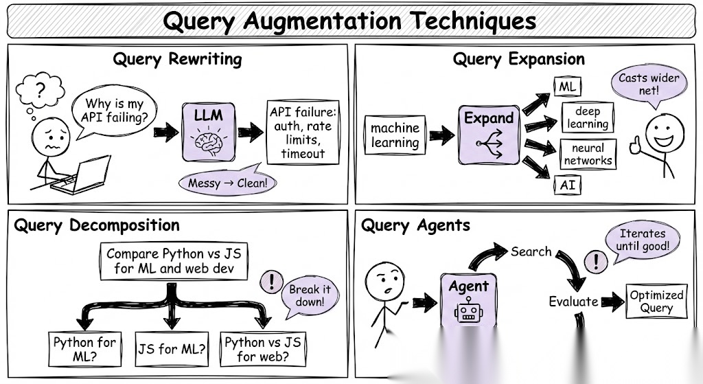 - 查询扩展:添加相关术语和同义词以扩大搜索范围。