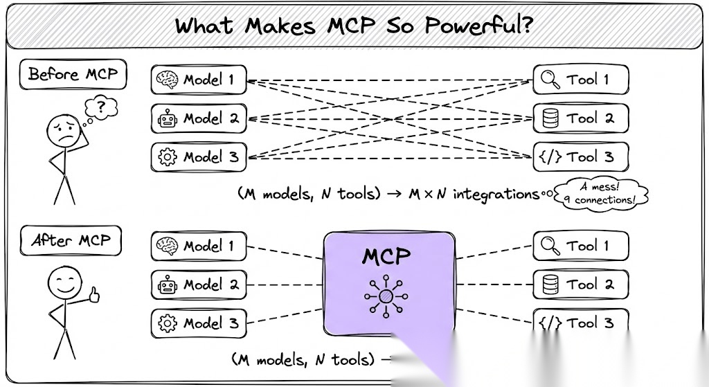 解释: MCP(可能指模型控制协议或类似标准)是一种协议,旨在标准化模型与工具之间的交互,从而减少集成复杂度,从乘法关系(N×M)优化为加法关系(N+M)。这降低了系统开发和维护的成本。