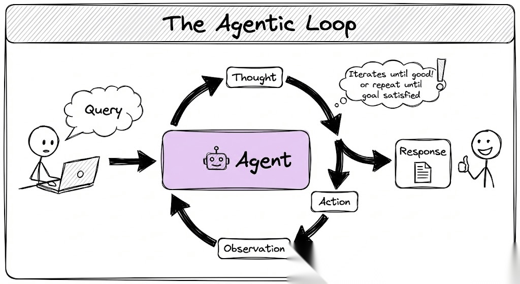 工具能扩展模型的能力,因为如果没有工具,模型就只能局限于其权重和上下文窗口中的信息。此外,智能体负责决定何时以及如何使用这些工具。智能体的基本运作循环如下所示:查询 → 思考 → 行动 → 观察 → (重复此过程直至目标满足) → 响应。
