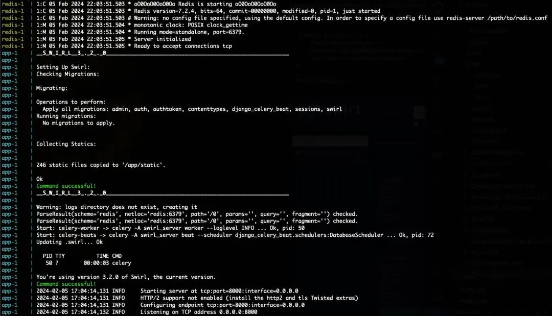 # 下载配置文件curl https://raw.githubusercontent.com/swirlai/swirl-search/main/docker-compose.yaml -o docker-compose.yaml# 启动(需要先装好Docker)docker-compose pull && docker-compose up